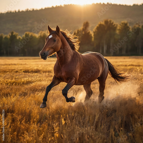 © SABq, Obraz premium Brown horse galloping through a golden field at sunset with motion blur in the background, capturing energy, freedom, and grace in a dynamic and dramatic composition.