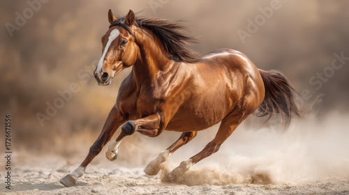 Fototapeta premium Brown horse galloping through sandy terrain under warm sunlight in an outdoor...