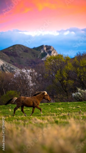 © Maja, Obraz premium Brown horse gallops across sunlit meadow by hills!