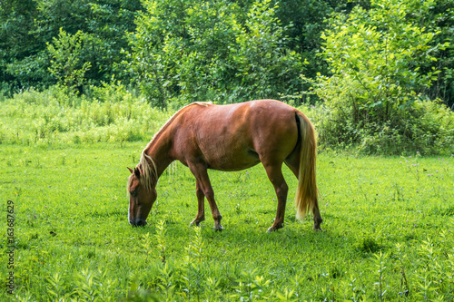 © k_samurkas, Obraz premium Brown horse grazes the green herb on pasture