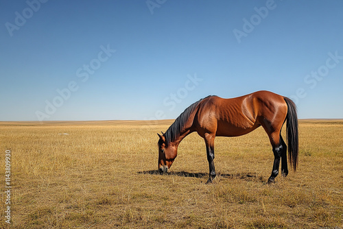 © PrimeStockGallery , Obraz premium Brown horse grazing in wide-open meadow, clear skies