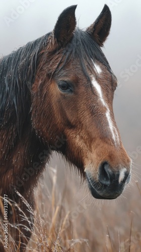 Obraz premium Brown Horse in Misty Field, Rain Water Droplets