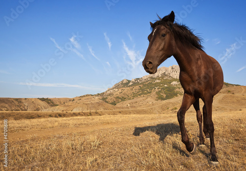 Fototapeta premium Brown horse in the wild on a dry grass field