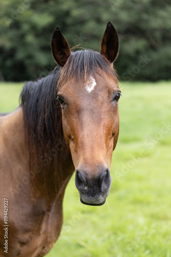 © Cavan, Obraz premium Brown Horse Looking at Camera in Green Pasture Close up