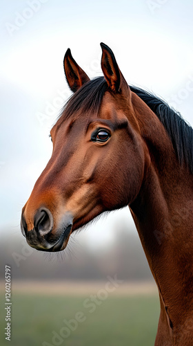 © Nadiyah, Obraz premium Brown horse portrait close-up outdoors, field background. Use animal farm