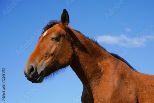 Fototapeta premium Brown horse standing in a sunny meadow with clear blue sky on a bright afternoon
