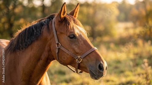 © edojob, Obraz premium Brown horse standing in field during golden hour sunset