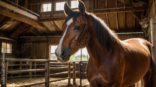 © Saad, Fototapeta premium Brown horse standing in stable, light streaming in