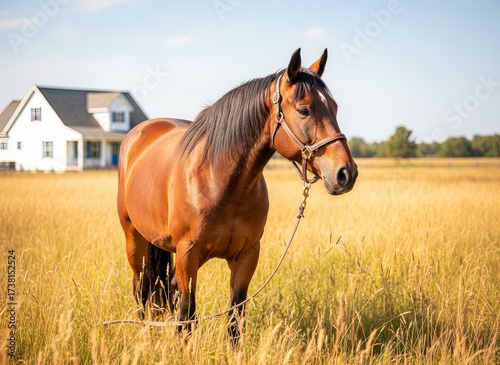 © Fluffy, Fototapeta premium Brown horse standing in tall grass near a white farmhouse under blue sky. Peaceful rural landscape with summer light, countryside scenery, and calm natural atmosphere.
