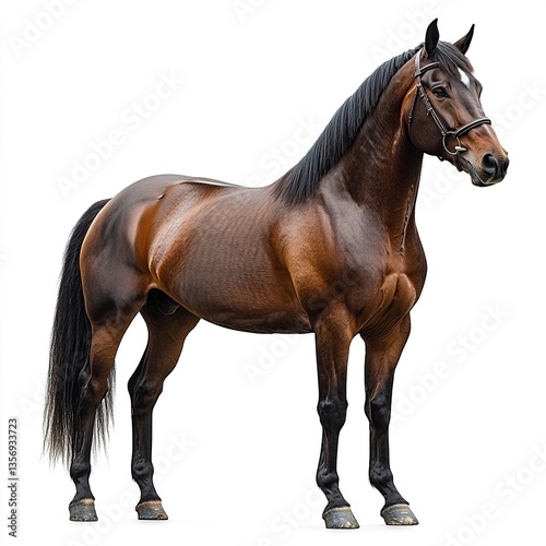 © THUA, Obraz premium Brown horse standing tall, side profile view showcasing its sleek coat and muscular build, isolated on a clean white background.