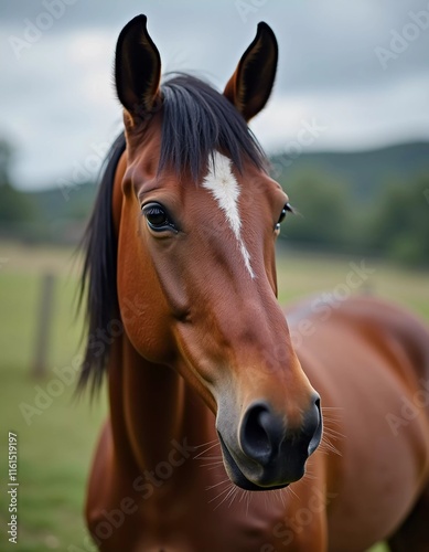 © Julija, Fototapeta premium Brown horse stands gracefully in open field, its expressive eyes reflecting soft light, creating serene atmosphere in landscape. Horses Equus, genus of Equidae of order Perissodactyls. Generative AI