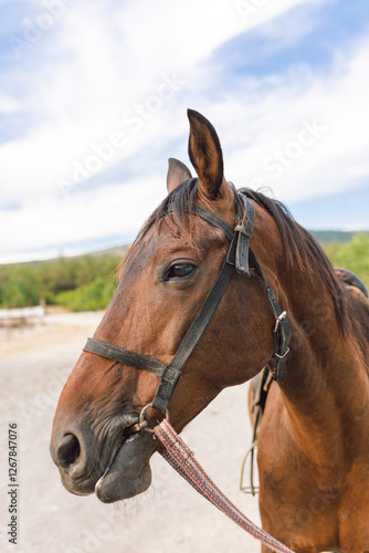 © яна винникова, Obraz premium Brown horse with a bridle stands patiently in a sunny outdoor setting during the day