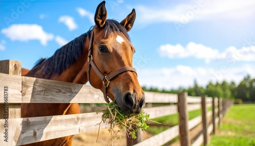 © M, Obraz premium Brown horse with a white patch chewing grass on a sunny day in a lush green pasture behind wooden fencing