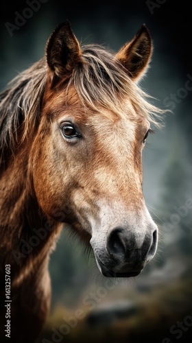 Fototapeta premium Brown horse with flowing mane stands majestically in a natural setting during...