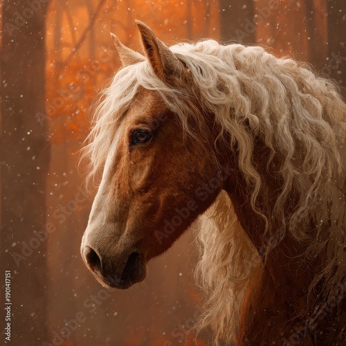Fototapeta premium Brown horse with long curly white mane standing in a snowy autumn forest backdrop