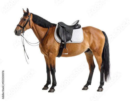 Fototapeta premium Brown horse with saddle isolated on white background.