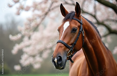 © Pete, Obraz premium Brown horse with white blaze on forehead stands near pink blossom trees. The equine wears a bridle, its mane black. Gentle spring atmosphere with blooming flowers.
