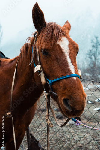 © Anna, Obraz premium Brown horse with white spot on face standing in outdoor paddock