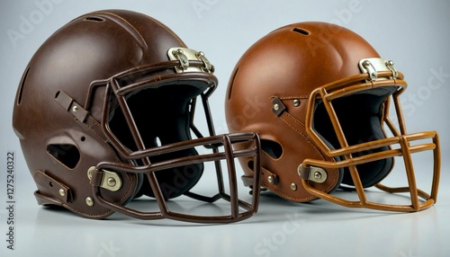 Naklejka premium Brown leather football helmets on light blue backdrop