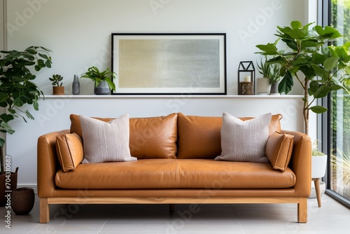 Fototapeta premium brown leather sofa in a living room with plants