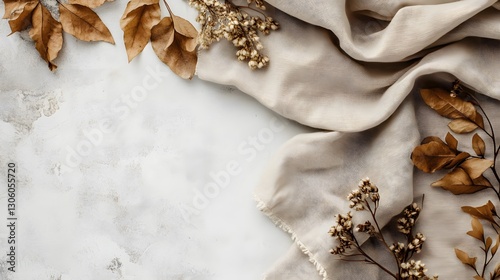 © Mahmulatin, Fototapeta premium Brown leaves and linen fabric on textured neutral surface