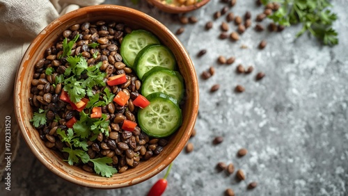 © Dreamy Pixel, Fototapeta premium Brown Lentil Salad Bowl with Cucumber and Cilantro.