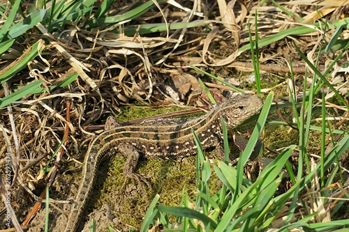 © natalya2015, Obraz premium Brown lizard on soil background in the garden
