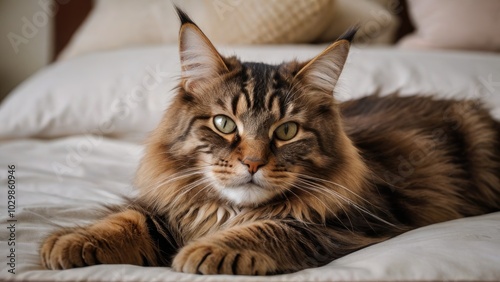 Obraz premium Brown maine coon cat lying on bed in the bedroom