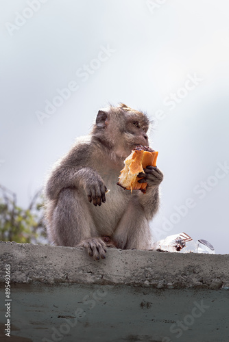 Naklejka premium Brown monkey sitting while eating bread in Pusuk Sembalun, Lombok, Indonesia