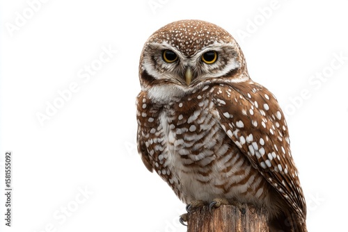 © munirahsamsudin, Fototapeta premium Brown owl with striking eyes perched on a wooden post