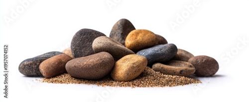 Obraz premium Brown pebbles and fine sand on white background ideal for gardening and...