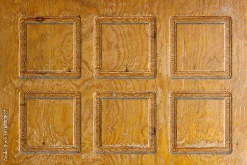 © lucky pics, Obraz premium Brown plywood door texture with square decorative recessions carved into it