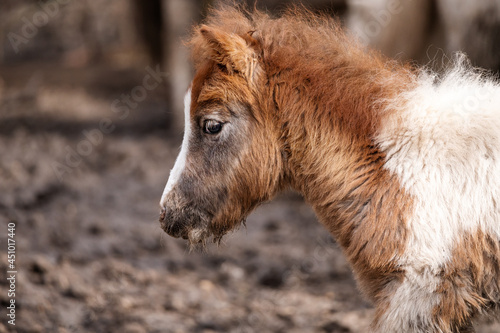 Fototapeta premium brown pony stallion with white spots in the zoo. portrait of a fluffy young horse in a paddock with slush