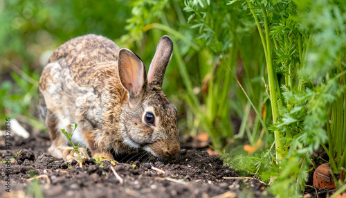 © FEBRINA COLLECTIONS, Fototapeta premium Brown rabbit noses soil near greenery, possibly searching for food in the garden