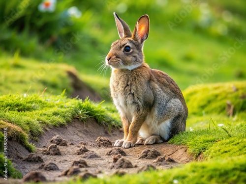 Fototapeta premium Brown rabbit sitting in grassy field, surrounded by its own footprints in the...