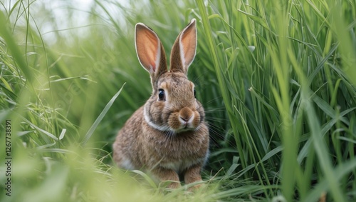 Fototapeta premium Brown rabbit sitting in tall green grass with ears perked up in a natural...