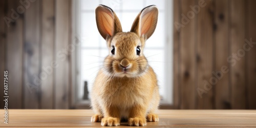 © Johnathan, Obraz premium Brown Rabbit Sitting on Wooden Table Generative AI