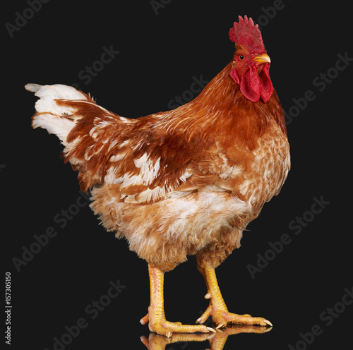© soleg, Fototapeta premium Brown rooster on black background, live chicken, one closeup farm animal