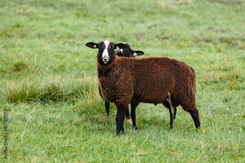 Fototapeta premium Brown sheep in the typical dutch landscape