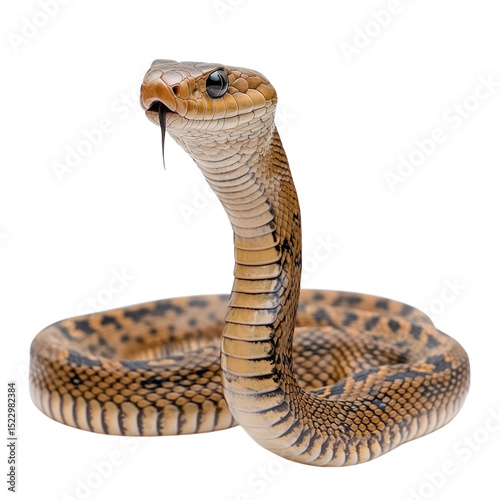 Fototapeta premium Brown snake with raised head displays warning posture on white background, transparent background, cutout PNG