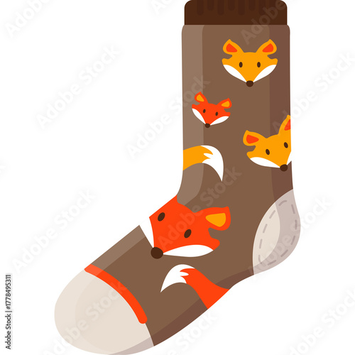 © najuabungairga, Naklejka premium Brown Sock With Orange Fox Faces And White Accents Cozy Footwear For Autumn Winter Season