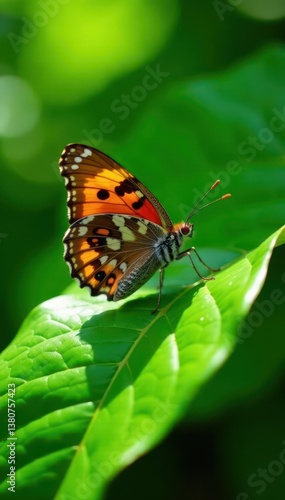 Obraz premium Brown speckled butterfly resting on vibrant green leaf, sunlight dappled ,...
