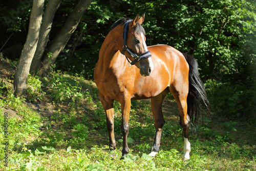 Fototapeta premium Brown sportive horse into forest ranch in summer evening