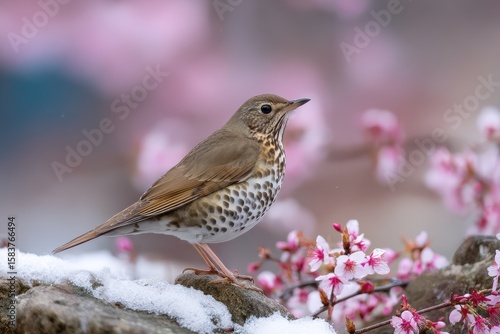 Fototapeta premium Brown spotted thrush perched gracefully on snow-covered surface amidst blooming cherry blossoms in early spring setting