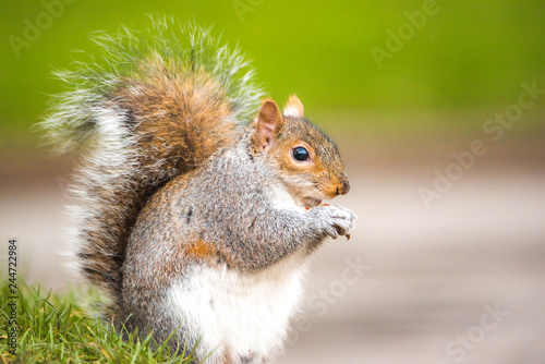 © Valentin, Obraz premium Brown squirrel eating nut closeup fluffy zoom sunny day green grass