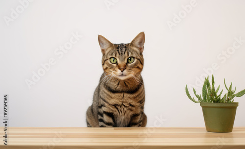 © Sweans, Obraz premium Brown Tabby Cat with Green Eyes Sitting on Top of a Table
