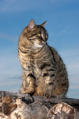 © slowmotiongli, Obraz premium Brown Tabby Domestic Cat, Female standing on Stack of Wood, Normandy