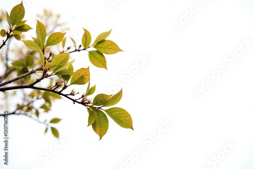 © Machita, Obraz premium Brown tree branch with small leaves and buds against bright white background, forest, earthy