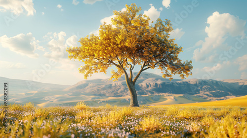 Fototapeta premium Brown tree with light green leaves In the middle of a yellow meadow