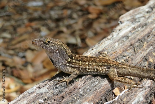 © natalya2015, Naklejka premium Brown tropical lizard on wooden background in Florida nature